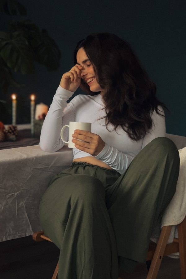 Saīsinātais tops ar garām piedurknēm lieliski sader ar augstas jostasvietas platajām biksēm, radot sievišķīgu tēlu un patīkamu, ērtu sajūtu.